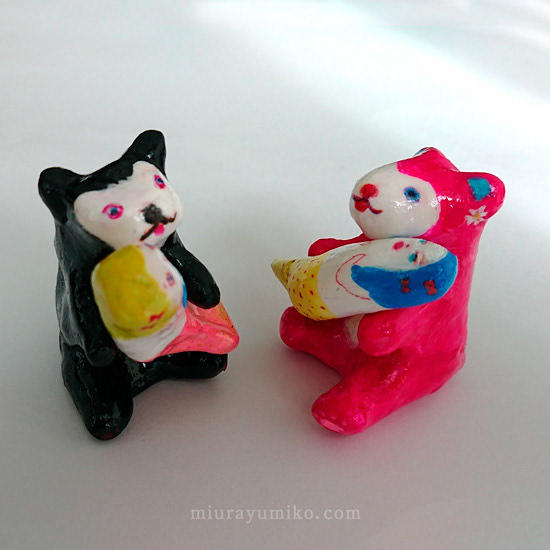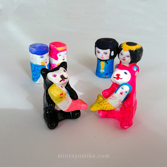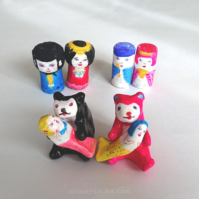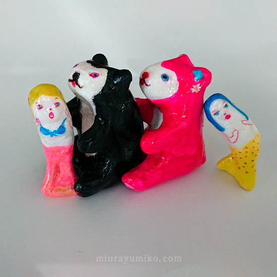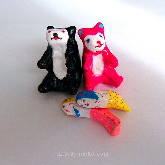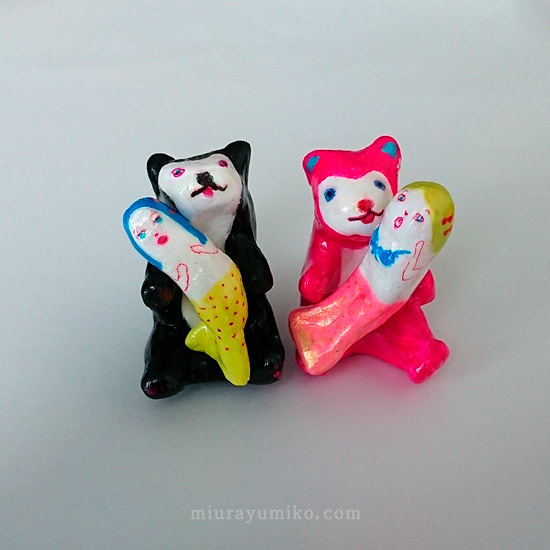 くま、人魚:石塑粘土、アクリルガッシュ、水性ニス